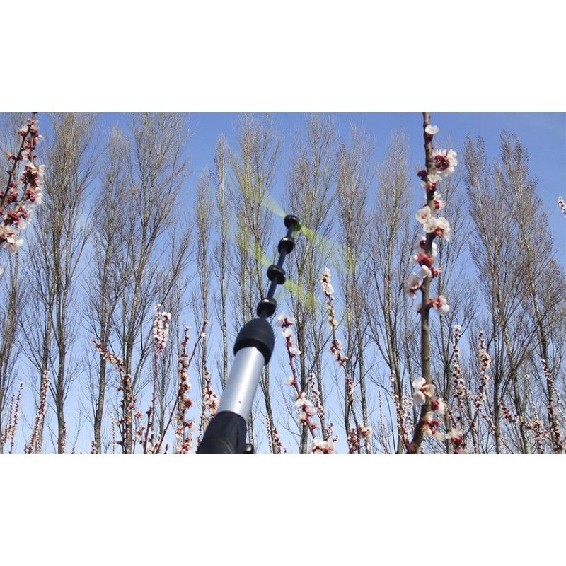 La pértiga telescópica, de 1,5 a 2,2 m de largo, le permite trabajar en total seguridad permaneciendo al mismo tiempo en el suelo.