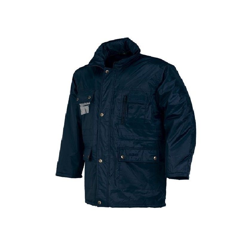 Parka ANTIFRÍO completamente impermeable con cuatro bolsillos externos y uno interno, capucha acolchada desmontable, porta identificación, porta teléfono, goma en la cintura.