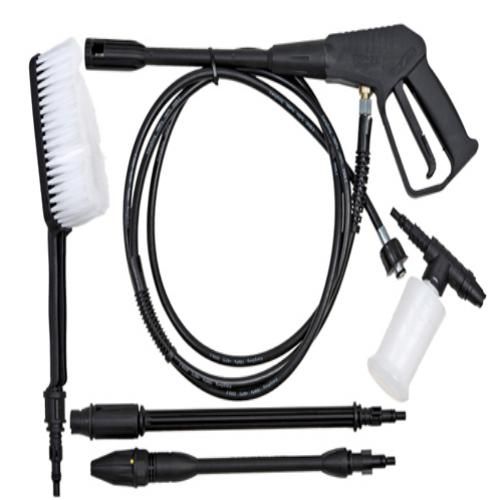 Bomba axial de 3 pistones de acero y cabezal de aleación ligera. Motor eléctrico 3400rpm., hasta 1800W., con protección térmica. Paro total automático. Salida producto químico. Filtro entrada agua. Cable eléctrico 5m. Funcionamiento en posición vertical. Mango y ruedas de transporte. Soporte para accesorios. Equipamiento completo:- Pistola + manguera alta presión 5m. - Lanza con boquilla de ángulo variable. - Lanza turbo. - Lanza espuma. - Cepillo fijo.