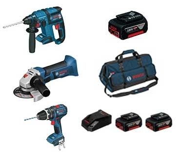 - Pack Bosch Martillo GBH 18 V-EC Pro+Taladro GSB 18 V-LI Pro+Amoladora GWS 18 V-LI Pro 3 baterías 4.0Ah+1 cargador+Bolsa transporte.