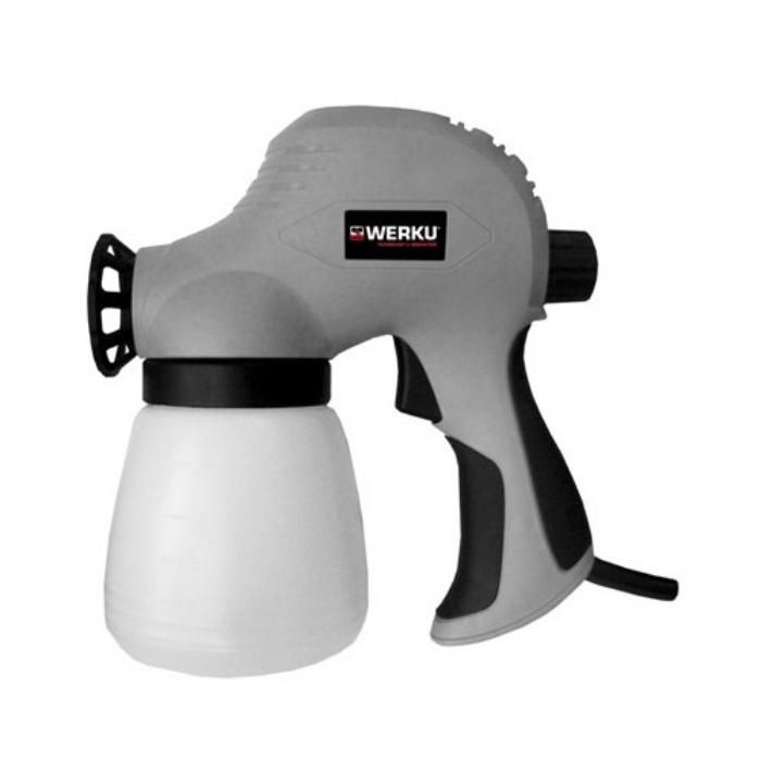 Pistola de pintar eléctrica, para todo tipo de esmaltes, barnices, etc. con control de dirección de abanico y regulador de fluido. Idóneo para el bricolador con trabajos esporádicos de lacado, barnizado, etc.